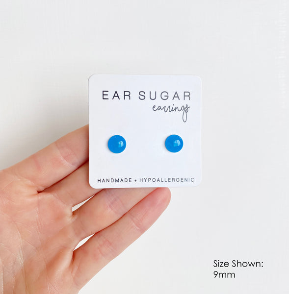 Each pair of Ear Sugar studs are carefully hand painted with custom mixed colors, set on surgical steel posts, and finished with a crystal clear dome of resin, surgical steel locking backs, and rubber comfort backs. Ear Sugar studs are lightweight, low profile, and waterproof, making them a perfect colorful accessory for your everyday life. You can sleep, bathe, swim, and play in them.