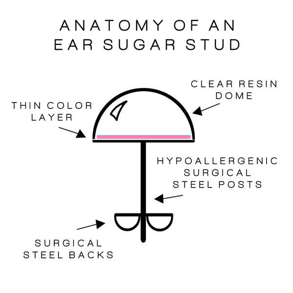 Each pair of Ear Sugar studs are carefully hand painted with custom mixed colors, set on surgical steel posts, and finished with a crystal clear dome of resin, surgical steel locking backs, and rubber comfort backs. Ear Sugar studs are lightweight, low profile, and waterproof, making them a perfect colorful accessory for your everyday life. You can sleep, bathe, swim, and play in them.