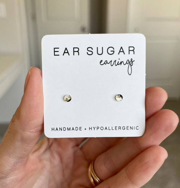 Each pair of Ear Sugar studs are carefully hand painted with custom mixed colors, set on surgical steel posts, and finished with a crystal clear dome of resin, surgical steel locking backs, and rubber comfort backs. Ear Sugar studs are lightweight, low profile, and waterproof, making them a perfect colorful accessory for your everyday life. You can sleep, bathe, swim, and play in them.