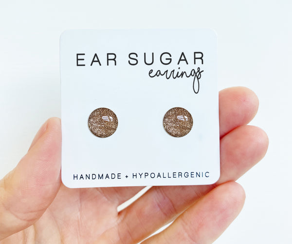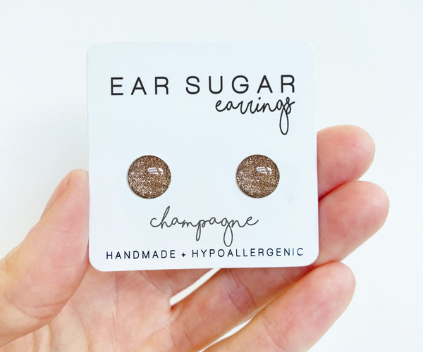 Each pair of Ear Sugar studs are carefully hand painted with custom mixed colors, set on surgical steel posts, and finished with a crystal clear dome of resin, surgical steel locking backs, and rubber comfort backs. Ear Sugar studs are lightweight, low profile, and waterproof, making them a perfect colorful accessory for your everyday life. You can sleep, bathe, swim, and play in them.