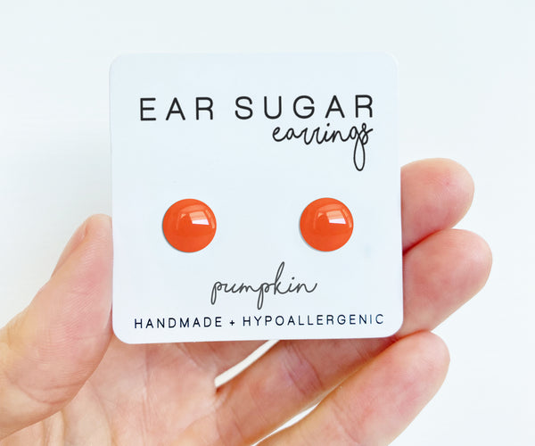 Each pair of Ear Sugar studs are carefully hand painted with custom mixed colors, set on surgical steel posts, and finished with a crystal clear dome of resin, surgical steel locking backs, and rubber comfort backs. Ear Sugar studs are lightweight, low profile, and waterproof, making them a perfect colorful accessory for your everyday life. You can sleep, bathe, swim, and play in them.